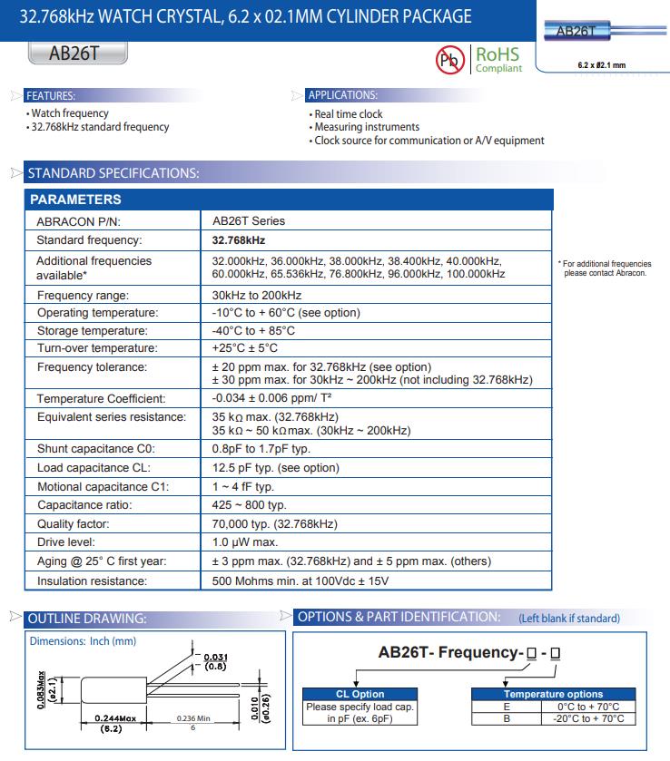 | AB26T-32.768KHZ | Abracon晶振 | AB26T | 32.768kHz | ±20ppm | 12.5pF | -10°C ~ 60°C |