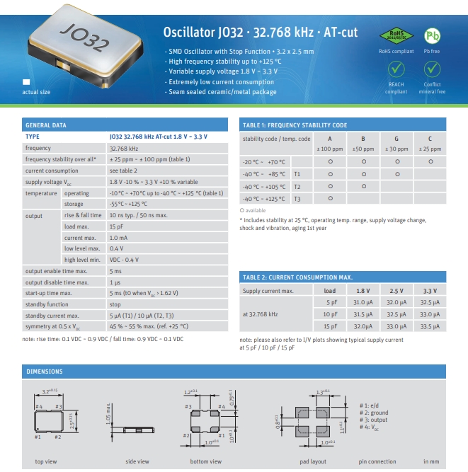 | O 0.032768-JO32-G-1V3-1-T1-OP-LF | Jauch振蕩器 | JO32 | XO (Standard) | 32.768 kHz | HCMOS |