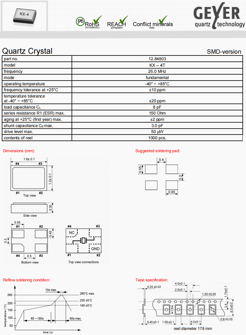 | 12.84803 | Geyer晶振 | KX-4 | 26 MHz | ±20ppm | ±10ppm | 8pF |