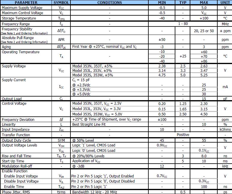 最大的電源電壓VCC - -0.5 - 5.0 V,最大控制電壓VC - -0.5 V電源電壓,儲(chǔ)存溫度測(cè)試- -40 + 100°C,頻率范圍fO - MHz頻率穩(wěn)定度,頻率偏移Δf + 25°C @裝運(yùn)時(shí)間,在VC±100——ppm范圍,允許輸入電壓VIH銷2或銷5邏輯“1”,輸出0.7 vcc——啟用,禁用輸入電壓維爾銷2或銷5邏輯“0”,輸出——0.3 vcc禁用,啟用時(shí)間TPLZ銷2或銷5邏輯“1”——- 100 ns,相位抖動(dòng),RMS tjrms帶寬12 kHz - 20 MHz - 0.5 - 1 ps.