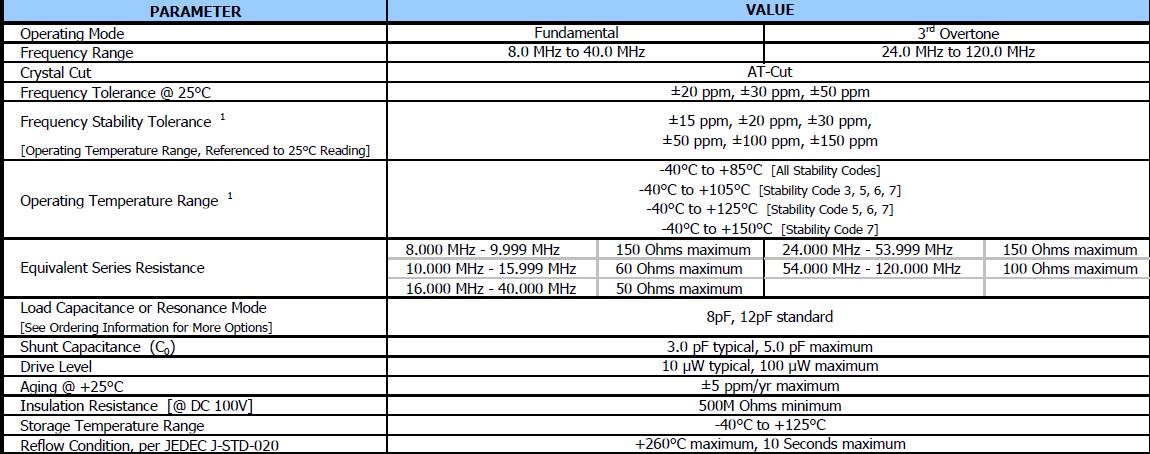 AEC-Q200兼容,標準5.0毫米x 3.2毫米玻璃密封包,基本晶體設計,頻率范圍8 - 40 MHz基本,24 - 120 MHz第三泛音頻率公差;±20 ppm,±30 ppm和±50 ppm,頻率穩(wěn)定度、參考訂購信息,操作溫度,-40°C + 125°C標準,磁帶和卷軸包裝標準,eia - 481,通過無鉛認證符合歐盟指令2011/65 /歐盟,無鉛終止完成,豁免7(c)-我,電氣和電子元件含鉛玻璃(Pb).