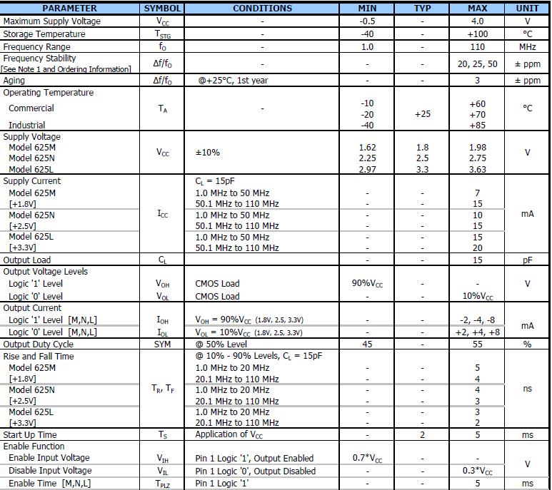 CTS石英晶振Model625,石英晶體振蕩器2520mm,標準2.5毫米x 2.0毫米4-Pad表面安裝包,HCMOS輸出,基本和第三泛音晶體的設計,頻率范圍1 - 110 MHz,頻率穩(wěn)定度±50 ppm標準,±25 ppm和±20 ppm,操作電壓+ 1.8 vdc,+ 2.5 vdc或+ 3.3伏直流,操作溫度為-40°C + 85°C,允許輸出標準,磁帶和卷軸包裝標準,eia - 418,符合RoHS .