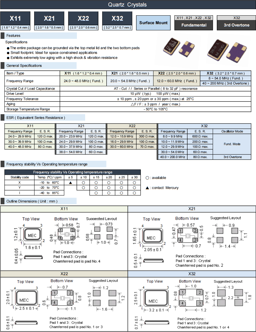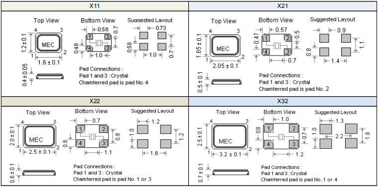 | 項(xiàng)目/型號(hào) | X11 ( 1.6 * 1.2 * 0.4 mm ) | X21 ( 2.0 * 1.6 * 0.5 mm ) | X22 ( 2.5 * 2.0 * 0.6 mm ) | X32 ( 3.2 * 2.5 * 0.7 mm ) |