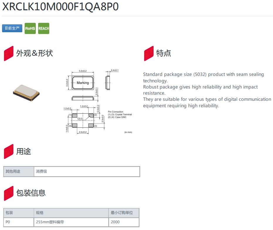XRCLK10M000F1QA8P0|10MHz|-30~85℃|8pf|5032mm,XRCLK10M000F1QA8P0晶振,頻率10MHz,工作溫度-30~85℃,負載8pf,尺寸5032mm,高可靠性晶振,無線通訊設(shè)備晶振,WIFI晶振,通信設(shè)備晶振,數(shù)碼相機晶振,醫(yī)療設(shè)備晶振.