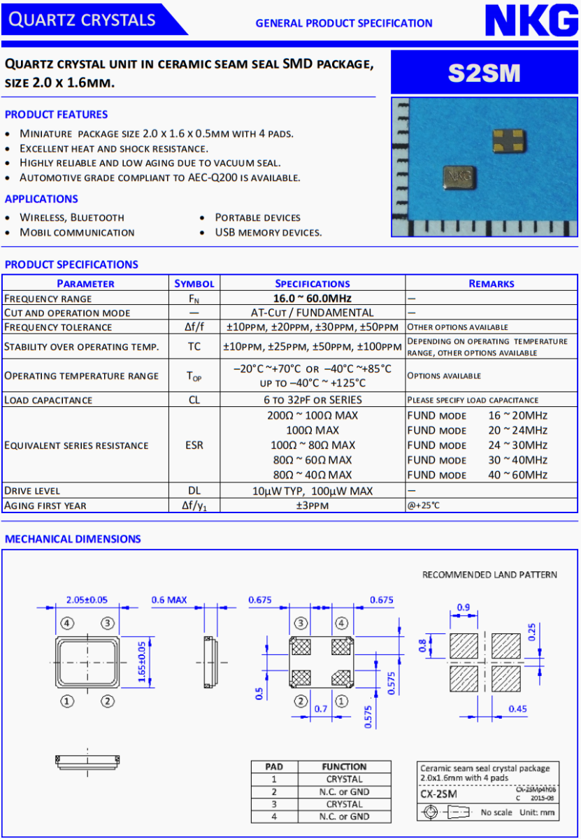 NKG超小型晶體,胎壓監(jiān)測(cè)裝置晶振,S2SM24.5760F12MYY-EXT貼片晶振,NKG晶振公司,無(wú)源晶振,貼片晶振,超小型晶振,2520晶振,液晶儀表盤晶振,石英晶振,耐高溫晶振,汽車多媒體設(shè)備晶振,6G通訊設(shè)備晶振,6G網(wǎng)絡(luò)終端晶振,無(wú)源晶振,貼片晶振。石英晶體單元在陶瓷縫密封SMD封裝,尺寸25. x 2.0mm。產(chǎn)品特點(diǎn):微型包裝尺寸2.5 x 2.0 x 0.5mm,有4個(gè)襯墊。優(yōu)異的耐熱性和抗震性。真空密封,可靠性高,老化率低。符合AEC-Q200標(biāo)準(zhǔn)的汽車級(jí)產(chǎn)品可供選擇。應(yīng)用范圍:無(wú)線、藍(lán)牙、移動(dòng)通訊、便攜設(shè)備、USB存儲(chǔ)設(shè)備