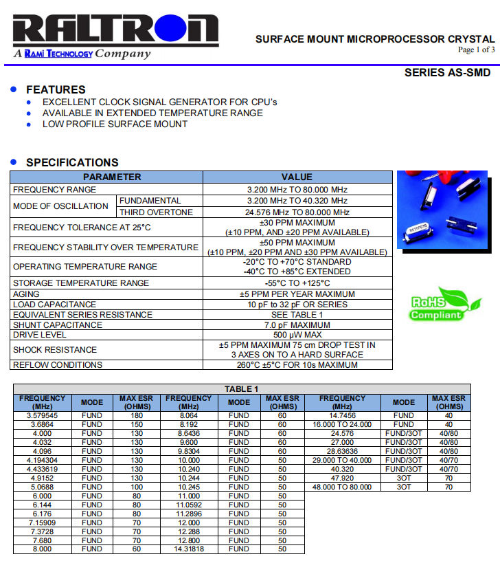 | AS-18.432-20-SMD-TR | AS-SMD | 18.432MHz | 13.50 x 4.80mm | ± 30 ppm | ± 50 ppm | 20 pF |