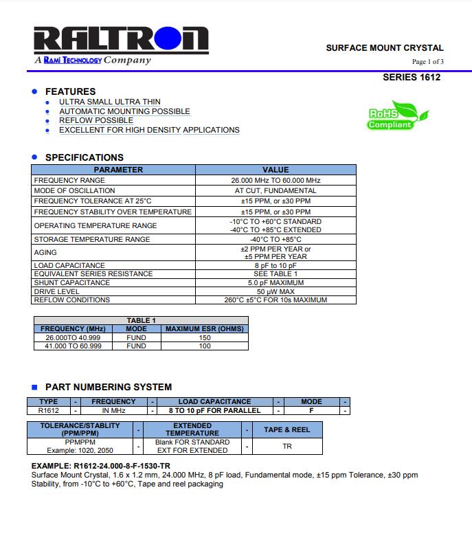 | R1612-24.000-8-1020-TR-NS1 | R1612 | 24.000MHz | 1.6 x 1.25mm | ± 10 ppm | ± 20 ppm | 8 pF |