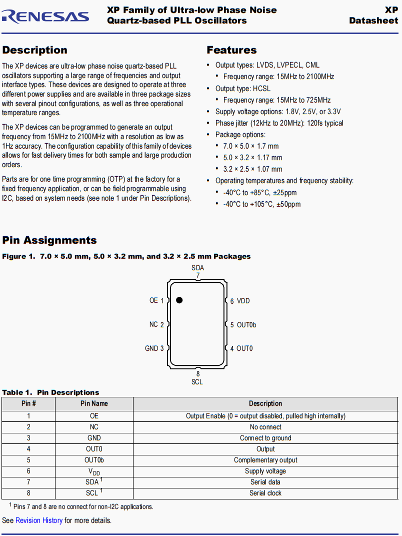 | XPC316800.000000I | Renesas晶振 | XP | 800 MHz | CML | 1.8V |
