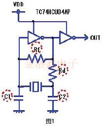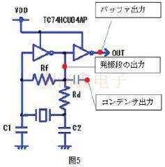 設(shè)計(jì)振蕩器電路時(shí),有必要認(rèn)識到各個(gè)組件的作用.因此,表1中以振蕩電路(圖1)為例,以通用C-MOSIC(東芝74HCU04AP)為例說明了每個(gè)電路的作用.
