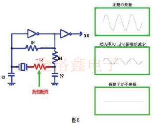 這是為了確認(rèn)晶振振蕩電路具有多少振蕩余量,并且根據(jù)所獲得的值來預(yù)測振蕩穩(wěn)定性的測量.如圖6所示,如果將一個(gè)電阻器(R)與振動器串聯(lián),并且該值增大,則振動器將不會在某個(gè)電阻值以上振蕩.即將停止振蕩之前的電阻值為負(fù)電阻值.