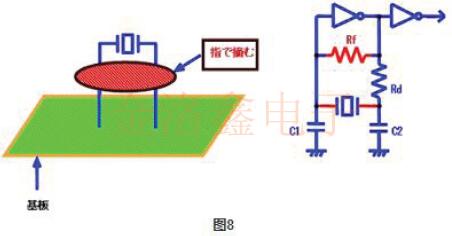 在要使用的振蕩電路中,檢查振蕩器是否可能以正常振蕩模式以外的其他模式振蕩.確定換能器的振蕩模式為基本模式時(shí),確認(rèn)高振蕩模式(從基本振蕩到第三階諧波的容易性)的簡單方法如圖9所示.2),示波器的波形為3.如果沒有泛音振蕩,則可以判斷為沒有異常振蕩的可能性.相反,示波器波形為3.如果發(fā)生泛音振蕩,則可以確定存在異常振蕩的可能性.用浸水的手指檢查的原因是在換能器端子之間形成一個(gè)小的電阻,并在圖8的電路圖中減小Rf以便于在高頻范圍內(nèi)振蕩.