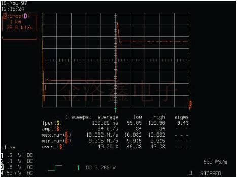 請(qǐng)注意,PLL的頻率(垂直軸)顯示出50%的過(guò)沖.這種稍微欠阻尼的響應(yīng)是一種折衷,可以實(shí)現(xiàn)更快的壓擺率容限和適中的捕獲范圍.LeCroy示波器可以通過(guò)多種方式用于PLL測(cè)量.現(xiàn)代的高性能微處理器通常使用內(nèi)部PLL來(lái)倍增系統(tǒng)時(shí)鐘頻率.制造商指定系統(tǒng)時(shí)鐘允許的最大周期到周期的變化.典型的規(guī)格是最大抖動(dòng)峰峰值小于250ps.由于無(wú)法訪問(wèn)PLL的輸出,因此重要的是系統(tǒng)時(shí)鐘輸入必須滿足此規(guī)范.工程師可以使用Jitter Track逐周期測(cè)量系統(tǒng)時(shí)鐘來(lái)驗(yàn)證系統(tǒng)時(shí)鐘是否符合此規(guī)格.如圖3所示.在100us記錄中,最大周期與周期周期之差為70ps.可直接從Jitter Track周期讀取該值,以在軌跡C中循環(huán)波形.垂直參數(shù)光標(biāo)之間的區(qū)域標(biāo)記為最大值.跡線A是所采集數(shù)據(jù)的縮放擴(kuò)展,顯示了兩個(gè)具有最大差異的相鄰周期.跡線B是Jitter Track周期,它讀取時(shí)鐘波形每個(gè)周期的絕對(duì)周期.