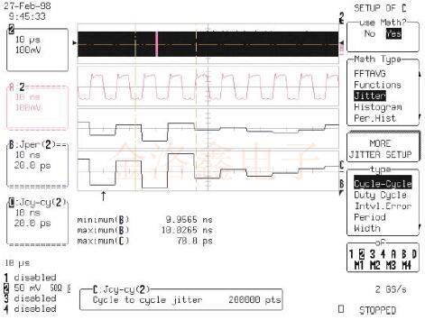 工程師可以使用Jitter Track逐周期測(cè)量系統(tǒng)時(shí)鐘來(lái)驗(yàn)證系統(tǒng)時(shí)鐘是否符合此規(guī)格.如圖3所示.在100us記錄中,最大周期與周期周期之差為70ps.可直接從Jitter Track周期讀取該值,以在軌跡C中循環(huán)波形.垂直參數(shù)光標(biāo)之間的區(qū)域標(biāo)記為最大值.跡線A是所采集數(shù)據(jù)的縮放擴(kuò)展,顯示了兩個(gè)具有最大差異的相鄰周期.跡線B是Jitter Track周期,它讀取時(shí)鐘波形每個(gè)周期的絕對(duì)周期.