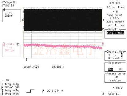 圖1顯示了使用時間間隔誤差(Jintvl)的JitterTrack來表征20MHz振蕩器在1ms測量窗口內(nèi)的穩(wěn)定性.該Cardinal溫補振蕩器非常穩(wěn)定,在測量窗口范圍內(nèi),我們正在測量低于100ps理想周期的誤差.換句話說,振蕩器的相位正在漂移.時間間隔誤差實質(zhì)上是測量輸入信號的相位誤差.頻率或周期的抖動跟蹤更適合于測量在整個測量間隔內(nèi)頻率發(fā)生變化的振蕩器.