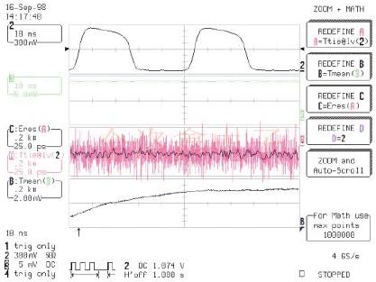 圖3說明了這種類型的測量.下部跡線是包含振蕩器的外殼內(nèi)溫度的趨勢圖.校準溫度探頭以每攝氏度產(chǎn)生1mV.跡線A是水平上的時間間隔誤差趨勢.軌跡A的平滑版本疊加在其頂部,以顯示時間間隔錯誤的主題變化.所有這些趨勢圖都包含2000個測量值.觸發(fā)釋抑用于每秒進行一次測量.趨勢包含2000秒的數(shù)據(jù),顯示石英晶體振蕩器的預熱.時間間隔誤差的趨勢表明溫度變化約8攝氏度時峰峰值變化約為+/-100ps.請注意,溫度與時間間隔誤差之間沒有明顯的關系.這些測量結果表明力科JTA封裝的測量和分析能力如何,以長記憶為輔,可用于表征振蕩器的長期,短期和環(huán)境穩(wěn)定性.