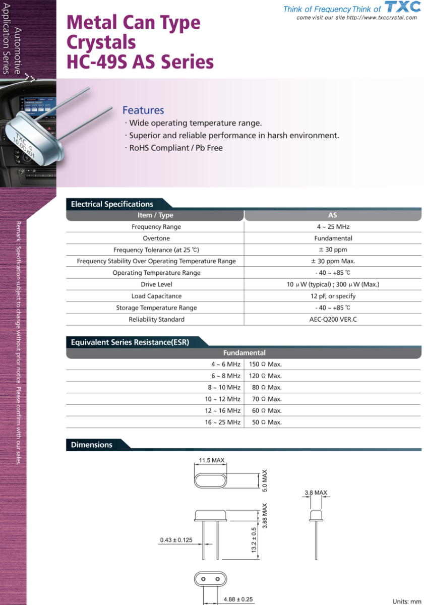 TXC49S晶體,車載收音機(jī)晶振,AS-4.194304MAHE-B晶振