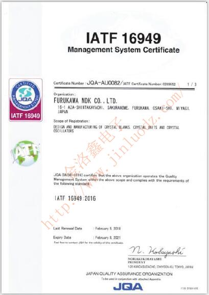 以上的料號只是例舉的一部分,NDK適用于汽車電子產(chǎn)品的石英晶振遠(yuǎn)不止這些,而且這部分型號只是普通晶體系列的,NDK公司汽車電子晶振系列分類,還有時鐘晶體振蕩器,溫補(bǔ)晶振,32.768K晶振等,以下是日本電波工業(yè)株式會社獲得的IATF:16949認(rèn)證證書. NX3225GA-26.000M-STD-CRG-2石英晶體NX3225SA-32M-EXS00A-02994貼片石英晶體NX3225SA-16.000000MHZ-B3汽車級晶振NX3225GA-24.576M-STD-CRG-2進(jìn)口晶振NX3225GA-26MHZ-TI壓電石英晶體NX3225SA-25.000M-STD-CSR-3諧振器NX3225SA-26.000000MHZ-G3車載晶振NX3225GA-26.000M-STD-CRG-1日本電波晶振NX3225GA-16.000M-STD-CRG-2晶振NX3225SA-20.000M-STD-CSR-3汽車電子晶振NX3225SA-39.000000MHZ-B4汽車導(dǎo)航晶振NX3225GA-14.31818M-STD-CRG-2石英晶體諧振器NX3225GA-27.000M-STD-CRG-1進(jìn)口晶振NX3225SA-26.000M-STD-CSQ-1日產(chǎn)晶振NX3215SA-32.768K-STD-MUA-8貼片石英晶體NX3225GA-32M-EXS00A-CG02611貼片晶振NX3225SA-24.000MHZ-STD-CSR-1日本電波晶振NX3225SA-30.000M-STD-CSR-3石英水晶振動子NX2520SA-16MHZ-STD-CSW-4壓電石英晶體NX3225GA-20.000M-STD-CRG-2石英晶振NX3225SA-16.000MHZ-STD-CSR-1石英晶體諧振器NX3225SA-32MHZ-EXS00A-CS02368貼片諧振器NX3215SA-32.768K-STD-MUA-9諧振器NX3225SA-20.000M-STD-CRS-2石英水晶振動子NX3225SA-32.000MHZ-STD-CSR-1貼片晶振NX3225SA-25.000M-STD-CRS-2石英晶體NX3215SA-32.768K-STD-MUA-14日本NDK晶振NX3225SA-16.000M-STD-CRS-2貼片諧振器NX3225SA-26.000MHZ-STD-CSR-1石英晶振NX3225SA-27M-STD-CRS-2壓電石英晶體NX3215SA-32.768K-STD-MUS-2日產(chǎn)晶振NX2520SG-19.2M-STD-CTX-1石英晶體NX3225SA-20.000MHZ-STD-CSR-1無源晶振NX3225SC-30.320M-EXS00A-CS03981晶振NX3225SA-27.000MHZ-STD-CSR-1汽車導(dǎo)航晶振NX3225SA-26.000000MHZ-G4石英晶體諧振器NX3225SA-14.31818MHZ-STD-CSR-1汽車級晶振NX3225SA-12MHZ-STD-CSR-6進(jìn)口晶振NX3225SA-16.000000MHZ-T1石英晶振NX3225SA-26.000000MHZ-B1貼片晶振NX3225SA-24.576MHZ-STD-CSR-1車載晶振NX3225SA-16MHZ-STD-CSR-6日本電波晶振NX3225SA-26.000000MHZ-G2無源晶振NX3225GA-20.000M-STD-CRG-1晶振