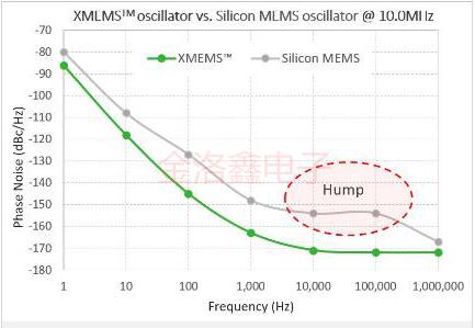 XMEMS™技術(shù)可以提供最佳的晶振相位噪聲性能,而不會出現(xiàn)通常在硅MEMS振蕩器相位噪聲性能圖中常見的鎖相環(huán)引起的相位噪聲'駝峰'.