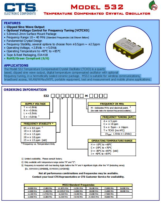 | 532L25DT26M0000 | CTS溫補(bǔ)晶振 | 532 | 26MHz | ±2.5ppm |