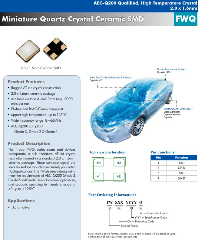 亞陶晶振4焊盤FWQ系列接縫密封裝置包含一個安裝在標(biāo)準(zhǔn)2.0x1.6mm中的超小型AT切割晶體諧振器陶瓷封裝。這些緊湊的晶體非常適合在密集的PCB應(yīng)用中進(jìn)行表面安裝。