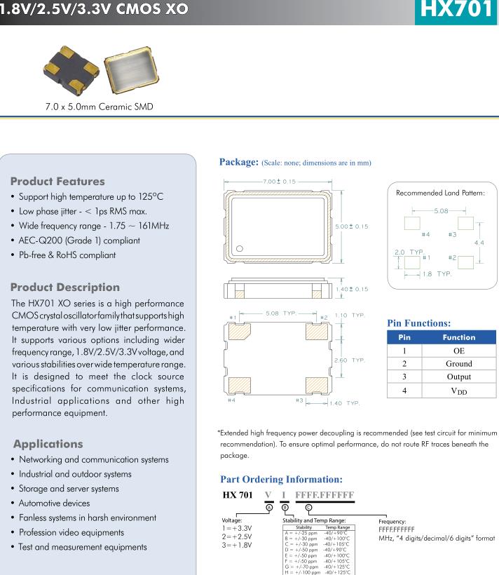HX701 XO系列是高性能的CMOS晶體振蕩器家族,支持具有極低抖動性能的溫度。它支持各種選項,包括更廣泛頻率范圍,1.8V/2.5V/3.3V電壓,和在較寬的溫度范圍內(nèi)具有多種穩(wěn)定性。它是為滿足時鐘源而設(shè)計的通信系統(tǒng)規(guī)范,工業(yè)應(yīng)用等較高設(shè)備性能。