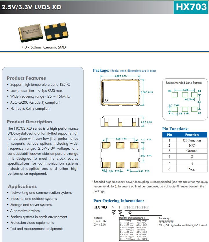 HX703系列滿足通信系統(tǒng)和其他高性能設(shè)備的時(shí)鐘源規(guī)范,HX7011C0050.000000,LVDS晶振,ECERA晶振