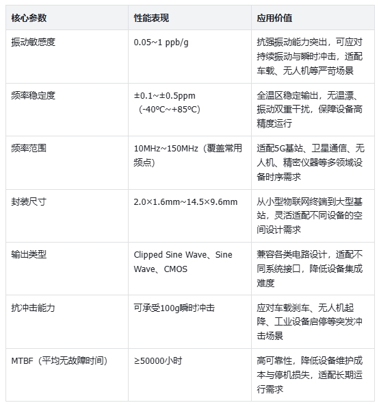 隨著高端電子設(shè)備向小型化,高精度,高可靠方向快速迭代,車載,航空航天,工業(yè)現(xiàn)場(chǎng)等場(chǎng)景的振動(dòng)干擾問題愈發(fā)突出,成為制約設(shè)備性能升級(jí)的核心瓶頸.振動(dòng)作為一種高頻次,強(qiáng)干擾的外部應(yīng)力,會(huì)通過機(jī)械耦合傳遞至晶振內(nèi)部,擠壓石英晶片的振動(dòng)模式,破壞時(shí)鐘信號(hào)的穩(wěn)定性,導(dǎo)致頻率偏移——這種偏移通常以ppb(十億分之一)為單位,看似微小,卻會(huì)對(duì)精密系統(tǒng)產(chǎn)生致命影響.例如,車載導(dǎo)航系統(tǒng)中,1~2ppb的頻率漂移即可導(dǎo)致定位誤差擴(kuò)大至數(shù)米,嚴(yán)重時(shí)引發(fā)航跡偏離;工業(yè)機(jī)器人運(yùn)行中,振動(dòng)引發(fā)的時(shí)序漂移會(huì)打亂指令節(jié)奏,導(dǎo)致動(dòng)作偏差,機(jī)械碰撞;無人機(jī)飛行時(shí),螺旋槳旋轉(zhuǎn)產(chǎn)生的持續(xù)振動(dòng),會(huì)影響導(dǎo)航與通信鏈路穩(wěn)定,甚至引發(fā)失控墜機(jī),這些場(chǎng)景都迫切需要一款具備超強(qiáng)抗振性能的溫補(bǔ)晶振產(chǎn)品.
