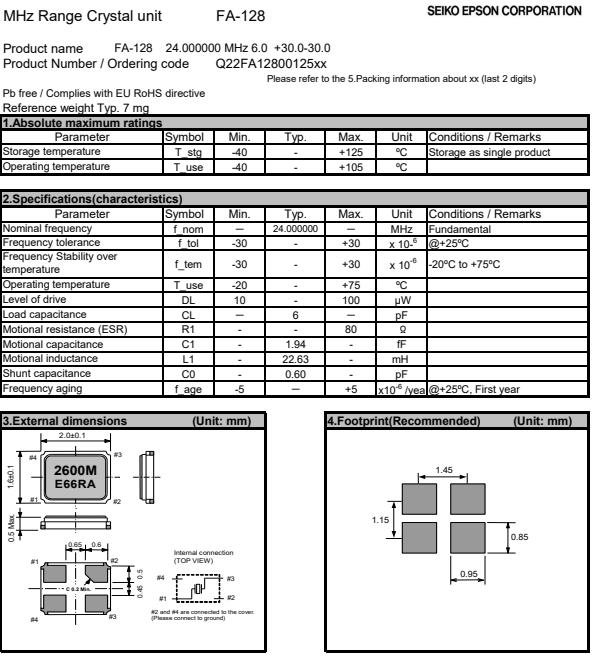 | Q22FA1280011400 | 2 x 1.6 x 0.5mm | FA-128 | 24.000000 MHz | 9 pF | +/-10 ppm |