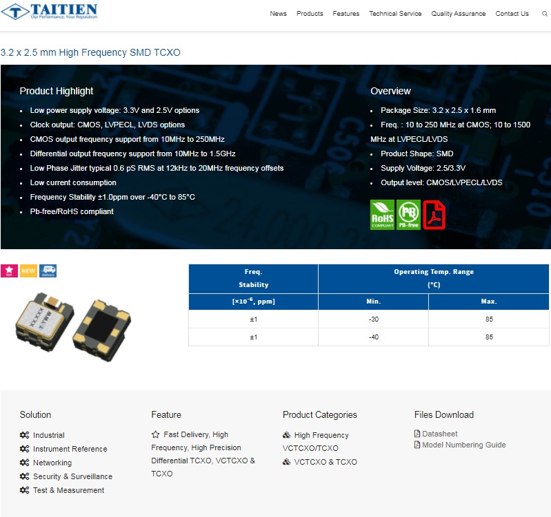 Frequency stability of TX series is ±0.5 ppm within its operating temperature ranging from -30° to +85°C. Input current is from 2.5~3.3 V at 1.0~1.5 mA with a typical low phase noise of -115 dBc/Hz at 100 Hz offset.