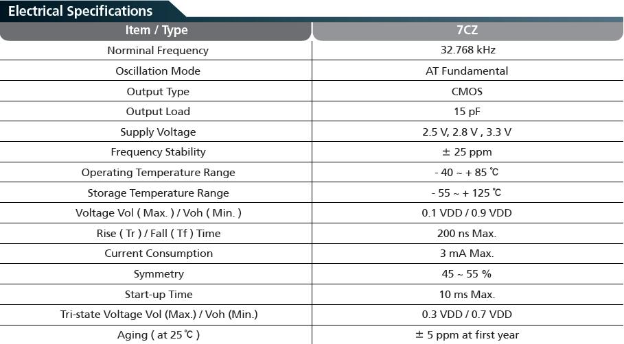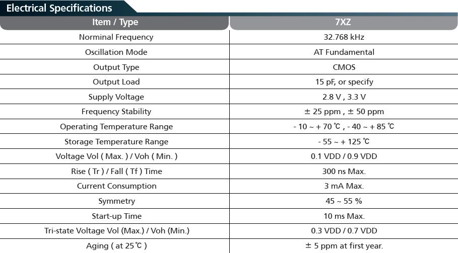 7XZ晶振是最為常用的3225尺寸封裝貼片石英晶振,參數(shù)如下: