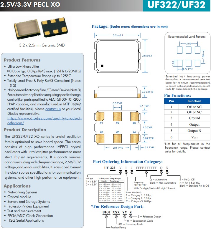 UFQ322/32系列超低抖動LVPECL晶體振蕩器,UF3221DA0212.500000,差分晶振,ECERA小體積晶振