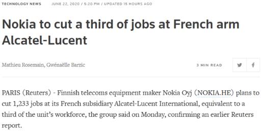 這次諾基亞一次性裁員1000多人,也會(huì)間接給供應(yīng)鏈造成一定的影響,業(yè)務(wù)量減少訂單同樣也會(huì)變少.諾基亞這一裁員聲明公布于各國(guó)積極部署5G移動(dòng)網(wǎng)絡(luò)之際,與此同時(shí),這則聲明在疫情發(fā)展未見明朗的法國(guó)引發(fā)了一定程度的政治反響,因?yàn)橹Z基亞在5年前買下Alcatel-Lucent時(shí),曾承諾保留工作崗位.據(jù)悉,承諾保留工作崗位這一條件加速了法國(guó)監(jiān)管機(jī)構(gòu)對(duì)該項(xiàng)收購(gòu)交易的審批.