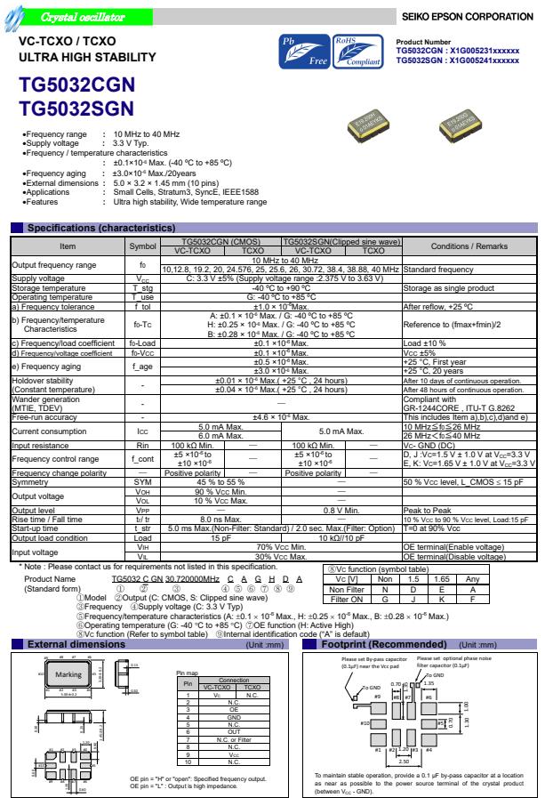 | X1G005231001700 | TG5032CGN | 10.000000 MHz | 5.00 x 3.20 x 1.45 mm | CMOS | 3.135 to 3.465 V | +/-1.0 ppm | -40 to ++85 °C |