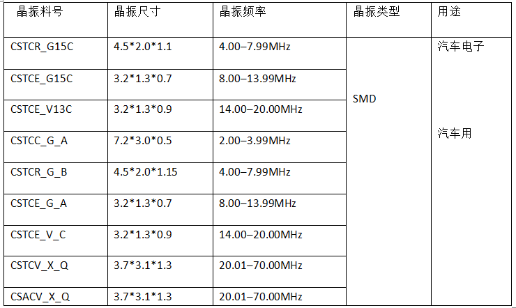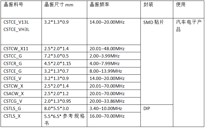 對(duì)于陶瓷晶振大家應(yīng)該不陌生,通常我們?cè)谵k公室看到的電話座機(jī)就會(huì)使用到陶瓷晶振,還有家有的遙控電路模塊也會(huì)使用到ZTT(三腳)和(ZTA)兩腳陶瓷晶振。那么接下就是給大家盤點(diǎn)一些汽車專用的村田貼片晶振與插件晶振的參數(shù),需要的可以拿個(gè)小本本記下來(lái)哦 村田晶振配備內(nèi)藏負(fù)載電容器的緊湊封裝型片狀“CERALOCK(陶瓷振動(dòng)子)”可保證極高的精確度,頻率的調(diào)整和表面封裝專有的技術(shù),實(shí)現(xiàn)了負(fù)載電容器內(nèi)藏片狀“CERALOCK”,振蕩電路無(wú)需任何外部連接負(fù)載電容器,內(nèi)部采用了村田先進(jìn)技術(shù)添加的內(nèi)部負(fù)荷電容,適用溫度低溫可到-40℃至120℃符合現(xiàn)實(shí)汽車內(nèi)置的高溫環(huán)境正常工作,產(chǎn)品具有外觀尺寸小,超薄,很適合汽車電子防盜遙控等小型產(chǎn)品應(yīng)用。