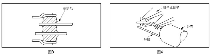(2)要修改彎曲的導(dǎo)腳時(shí),要壓住外殼基側(cè)的導(dǎo)腳,且從上下方壓住彎曲的部位,再進(jìn)行修改(參閱圖 4)。