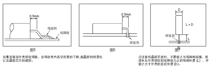 另外,如果利用高溫或長(zhǎng)時(shí)間對(duì)導(dǎo)腳部位進(jìn)行加熱,會(huì)導(dǎo)致晶振特性的惡化以及晶振的破損。因此,請(qǐng)注意對(duì)導(dǎo)腳部位的加熱溫度要控制在 300°C以下,且加熱時(shí)間要控制在5秒以內(nèi) (外殼的部位的加熱溫度要控制在150°C以下)。