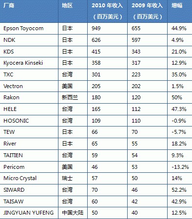 然而在大陸地區(qū),還是不免還是有諸多愛(ài)國(guó)人士,會(huì)選用臺(tái)產(chǎn)晶振,比如(HOSONIC)鴻星晶振,其實(shí)此款晶振不比以上幾款晶振的差,差別只是沒(méi)以上幾款晶振的名聲響而已。以下是2010年時(shí)各大晶振廠家的收入排名,就可以看出鴻星晶振在海內(nèi)外的火熱程度。
