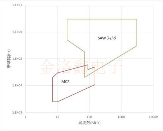 水平軸是標稱頻率,垂直軸是通帶寬度,表明與SAW濾波器相比,MCF的可制造范圍是低頻/窄帶.