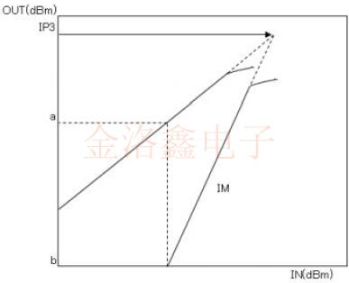主信號輸出電平和互調輸出電平的直線相交的點稱為三階交調點(IP3).實際上,它會飽和到一定的水平,因此線條不會彼此相交,而要點是,直線區(qū)域不會按原樣飽和,如果水平升高,則會相交.
