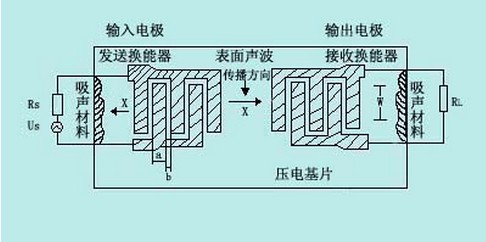 這種濾波器的基片是由壓電材料(如鈮酸鋰或石英晶體)制成,在基片上蒸鍍兩組“叉指電極”,一般由金屬薄膜用光刻工藝刻成。左側(cè)接信號源的一組稱為發(fā)送換能器,右側(cè)接負(fù)載的一組稱為接收換能器,圖中a、b分別為電極寬度和極間距離,W為相鄰叉指對的重疊長度,稱為“叉指孔徑”。當(dāng)交變的電信號us加到發(fā)送換能器的兩個(gè)電極上時(shí),通過反壓電效應(yīng),基片材料就會產(chǎn)生彈性形變,這個(gè)隨信號變化的彈性波,即“聲表面波”,它將沿著垂直于電極軸向(圖中x方向)向兩個(gè)方向傳播,一個(gè)方向的聲表面波被左側(cè)的吸聲材料吸收,另一方向的聲表面波則傳送到接收換能器,由正壓電效應(yīng)產(chǎn)生了電信號,再送到負(fù)載RL。但叉指換能器的形狀不同時(shí),濾波器對不同頻率信號的傳送與衰減能力就會不一樣。