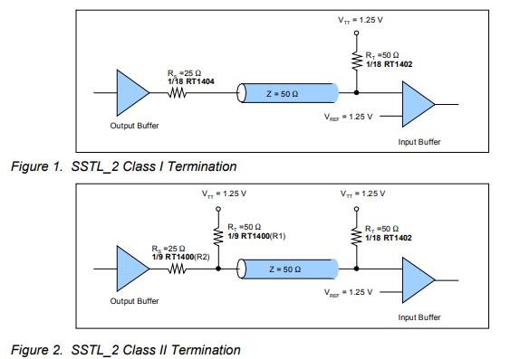 所需的終止樣式基于DDR內存應用程序。滿足EIA/JEDEC標準JESD8-9A正確信號處理要求的兩類終端如圖1和圖2所示。在0-2.5伏邏輯交換范圍內工作的2.5VI/O存儲器總線標準是SSTL_2,該標準適用于高速DDRSDRAM接口。DDR本質上不需要提高時鐘頻率就能加倍提高SDRAM的速度,它允許在時鐘脈沖的上升沿和下降沿讀出數(shù)據(jù),因而其速度是標準SDRAM的兩倍.