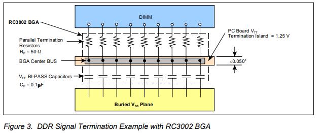 圖3展示了將雙通電容器集成到BGA部件中的優(yōu)勢。設計人員應在頂部PCB層上安裝0.050“寬的VTT端接島,以優(yōu)化印刷電路板(PCB)布局和布線。VSS平面位于下埋PCB層,如果可能,應該沒有插槽。