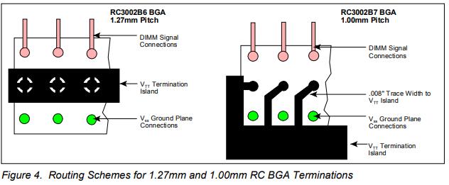 終端電阻應盡可能靠近雙列直插式內存模塊(DIMM)插槽,以最大限度地減少信號路由長度。如果使用電阻陣列或僅帶終端電阻的BGA網(wǎng)絡,雙通電容應放置在VTT終端島和VSS平面之間,每兩個終端電阻至少有一個0.01μF電容,間隔均勻。采用任何一種端接方法,PCB應在端接島的每端包含一個10μF鉭電容,用于批量去耦。圖3顯示了采用帶終端電阻和雙極電容的BGA封裝的完整終端解決方案示例。